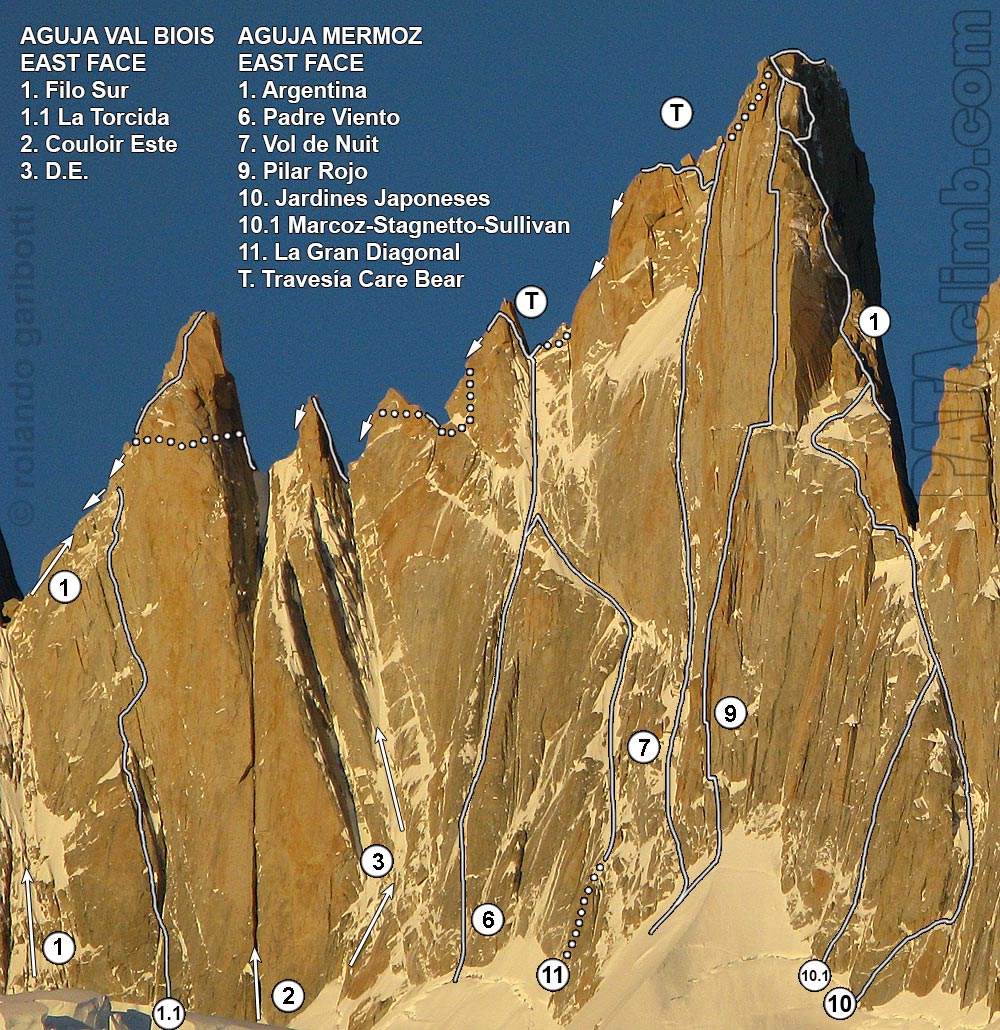 * Aguja Mermoz(照片):[https://pataclimb.com/images/climbingareas/chalten/fitz/mermoz_E_01.jpg Pataclimb.com]